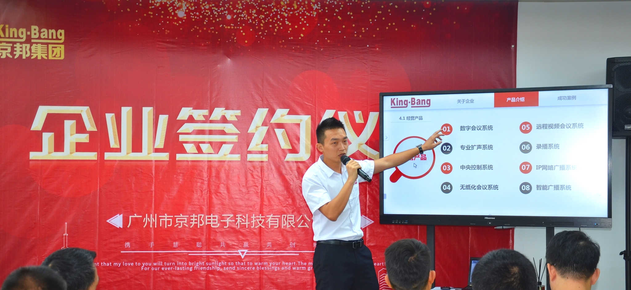 京邦電子(KING-BANG)本次活動(dòng)為慧聰網(wǎng)買(mǎi)家團(tuán)帶來(lái)了全新的會(huì)議系統(tǒng)、網(wǎng)絡(luò)廣播系統(tǒng)、智能交互式無(wú)紙化會(huì)議系統(tǒng)、分布式多媒體中控矩陣系統(tǒng)及專業(yè)擴(kuò)聲等多個(gè)系統(tǒng)應(yīng)用,以“為客戶創(chuàng)造價(jià)值,為客戶解決問(wèn)題,至誠(chéng)服務(wù)客戶“出發(fā),為行業(yè)帶來(lái)領(lǐng)先的音視頻整體解決方案和服務(wù)模式。